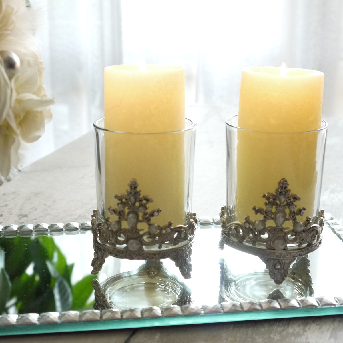 | 商品の特徴 | ピューターグラス キャンドルホルダー | BIJOU FLOWER。Pewter Pair Candle Holder|ピューター製キャンドルホルダー。。装飾的な金属ベースと透明なガラスシェードのキャンドルホルダー。鉄の十字架 溶接 抽象的なイエスキリスト像 アイアン モダニズム キュビズム。【英国】【白蝶貝】アフタヌーンティーカトラリーセット 専用ケース。製造∶カナダ·シーガル社ーサイズ∶高さ約27㌢ 径.上部16,5㌢- 素材: ガラスと金属の珠洲とニッケル-ピューター- キャンドルの色: ホワイト キャンドル周りの飾り用として、ドイツトウヒ 5個とウッド系ポプリをサービス- デザイン: 装飾的な純度の高いピューター製と透明なガラスシェードベースの型に手作業で植物模様を仕上げていて、温かみのある柔らかさを仕上げていますキャンドルの他ドライリーフやフラワーを入れて飾ったり、オリジナルな楽しみ方で美しく彩ってみて頂けたらと思いますご覧いただきありがとうございます。 | ||