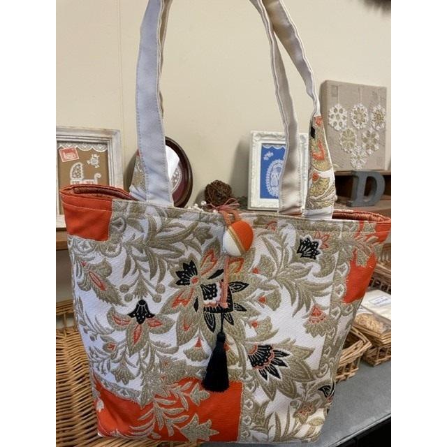 - レディース > 着物・浴衣 > 丸帯×本革 着物リメイク トートバッグ ハンドメイド 手提げ 袋帯 アンティーク ハンドメイド◇着物・帯リメイクトートバッグ ゴールドオレンジ : Crea