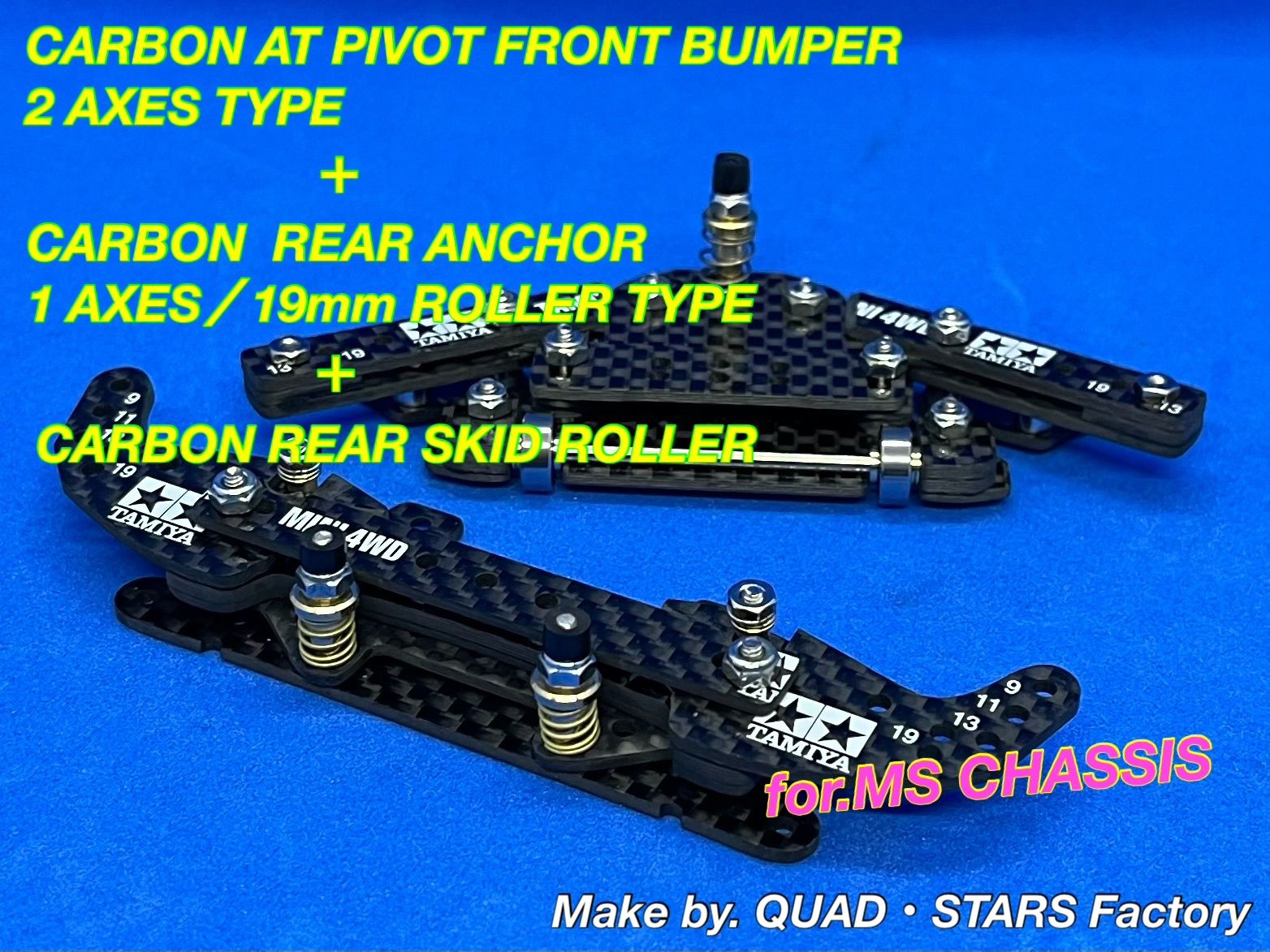 | 商品の特徴 | ミニ四駆・MS用】2軸ATピボットバンパー+1軸リヤアンカー 2022。ミニ四駆・MS用】2軸ATピボット+1軸リヤアンカー2022/フルカーボン。ミニ四駆・MS用】2軸ATピボット+1軸リヤアンカー2022/フルカーボン。。☀️お得な【まとめ買い申請】募集中☀️⚠️こちらのカーボンユニットは、ミニ四駆のセットアップにある程度慣れた【中級〜上級者向け】のカスタムパーツです⚠️◉2軸ATピボットバンパーのレシピ・リヤブレーキステー/J-CUP2022 ×1・フロントワイドステー ×3・マルチ補強プレート ×1・マルチ強化プレート ×1【スライドダンパー用スプリング(4種類付属)】◾️ピボット部分:ハード/シルバー ×2◾️2軸部分: ミディアム/ゴールド ×2【交換用】◾️ソフト/ブラック ×2◾️スーパーハード/シルバーメッキ ×2⚫︎2軸ATピボットバンパーの重さ:約13.7g※シャーシ取り付け用の皿ビス、ナット類含む◉1軸リヤアンカー/13mmローラー対応のレシピ・リヤブレーキステー/J-CUP2022 ×1・リヤワイドステー/ J-CUP2024 ×2・直カーボン ×3◉ローラーアンダーガード・リヤブレーキステー ×2【ダンガン用タルバネ(2種類付属)】◾️1軸部分:ハード/シルバー ×1【交換用】◾️ソフト/ブラック ×1⚫︎1軸リヤアンカーの重さ:約15.8g※シャーシ取り付け用の皿ビス、ナット類含む【追加オプション】①ピボット稼働部分/段下げ3mm厚加工 2,998円②フロント提灯/カーボン 3,998円③リヤスキッドローラー/830ベアリング 4,998円④お辞儀防止FRPプレート/TYPE-A&TYPE-Bセット 2,498円⑤お辞儀防止FRPプレート(単品) 各1,298円✅2軸ATリジットバンパー仕様に変更、✅1軸リヤアンカーを19mmローラー対応に変更、✅ロックナットのカラー変更など、その他のご要望も【コメント欄】から承ります^ ^↓↓よろしければ他にも出品していますのでこちらも併せてご覧ください↓↓#QUAD・STARS/MSシャーシの商品一覧はこちら#QUAD・STARS/カーボンの商品一覧はこちら↑↑タップでミニ四駆のみの見やすいページに飛びます↑↑【ご案内】・タミヤ純正パーツのみを取り扱っておりますので、公式レースでも安心してご利用いただけます。ミニ四駆・MSシャーシ用】2軸ATピボットバンパー+1軸リヤアンカー+。・カーボンユニット以外は別売ですm(_ _)mNo.6-34 | ||